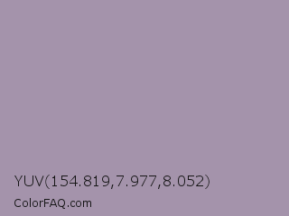 YUV 154.819,7.977,8.052 Color is a light purple color and the nearest color is Heliotrope Gray #aa98a9. Hex code #a493ab and RGB value is rgb(164,147,171). In RGB color space, this color is composed of 64% red, 58% green, 67% blue, In CMYK color space, this color is composed of 4% cyan, 14% magenta, 0% yellow , 33% black , In HSL color space, this color has a hue angle of 283° , 13% saturation and 62% lightness.