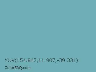 YUV 154.847,11.907,-39.331 Color is a normal cyan color and the nearest color is Moonstone Blue #73a9c2. Hex code #6eadb3 and RGB value is rgb(110,173,179). In RGB color space, this color is composed of 43% red, 68% green, 70% blue, In CMYK color space, this color is composed of 39% cyan, 3% magenta, 0% yellow , 30% black , In HSL color space, this color has a hue angle of 185° , 31% saturation and 57% lightness.