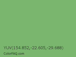 YUV 154.852,-22.605,-29.688 Color is a normal green color and the nearest color is Bud Green #7bb661. Hex code #79b56d and RGB value is rgb(121,181,109). In RGB color space, this color is composed of 47% red, 71% green, 43% blue, In CMYK color space, this color is composed of 33% cyan, 0% magenta, 40% yellow , 29% black , In HSL color space, this color has a hue angle of 110° , 33% saturation and 57% lightness.