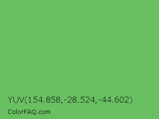 YUV 154.858,-28.524,-44.602 Color is a normal green color and the nearest color is Mantis #74c365. Hex code #68c061 and RGB value is rgb(104,192,97). In RGB color space, this color is composed of 41% red, 75% green, 38% blue, In CMYK color space, this color is composed of 46% cyan, 0% magenta, 49% yellow , 25% black , In HSL color space, this color has a hue angle of 116° , 43% saturation and 57% lightness.