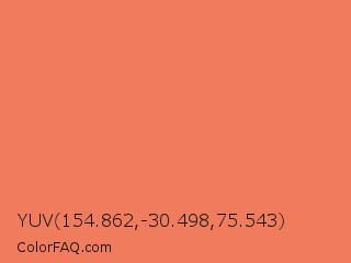 YUV 154.862,-30.498,75.543 Color is a light red color and the nearest color is Burnt Sienna #e97451. Hex code #f17b5d and RGB value is rgb(241,123,93). In RGB color space, this color is composed of 95% red, 48% green, 36% blue, In CMYK color space, this color is composed of 0% cyan, 49% magenta, 61% yellow , 5% black , In HSL color space, this color has a hue angle of 12° , 84% saturation and 65% lightness.