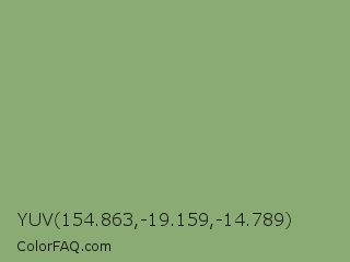 YUV 154.863,-19.159,-14.789 Color is a normal green color and the nearest color is Asparagus #87a96b. Hex code #8aab74 and RGB value is rgb(138,171,116). In RGB color space, this color is composed of 54% red, 67% green, 45% blue, In CMYK color space, this color is composed of 19% cyan, 0% magenta, 32% yellow , 33% black , In HSL color space, this color has a hue angle of 96° , 25% saturation and 56% lightness.