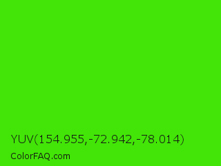 YUV 154.955,-72.942,-78.014 Color is a normal green color and the nearest color is Harlequin #3fff00. Hex code #42e507 and RGB value is rgb(66,229,7). In RGB color space, this color is composed of 26% red, 90% green, 3% blue, In CMYK color space, this color is composed of 71% cyan, 0% magenta, 97% yellow , 10% black , In HSL color space, this color has a hue angle of 104° , 94% saturation and 46% lightness.