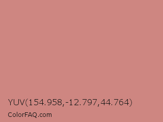 YUV 154.958,-12.797,44.764 Color is a light red color and the nearest color is New York Pink #d7837f. Hex code #ce8681 and RGB value is rgb(206,134,129). In RGB color space, this color is composed of 81% red, 53% green, 51% blue, In CMYK color space, this color is composed of 0% cyan, 35% magenta, 37% yellow , 19% black , In HSL color space, this color has a hue angle of 4° , 44% saturation and 66% lightness.