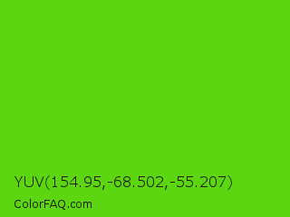 YUV 154.95,-68.502,-55.207 Color is a normal green color and the nearest color is Harlequin Green #46cb18. Hex code #5cd610 and RGB value is rgb(92,214,16). In RGB color space, this color is composed of 36% red, 84% green, 6% blue, In CMYK color space, this color is composed of 57% cyan, 0% magenta, 93% yellow , 16% black , In HSL color space, this color has a hue angle of 97° , 86% saturation and 45% lightness.