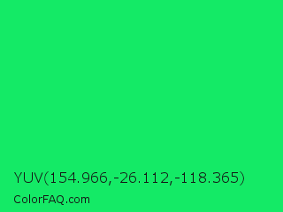 YUV 154.966,-26.112,-118.365 Color is a normal green color and the nearest color is Malachite #0bda51. Hex code #14ea66 and RGB value is rgb(20,234,102). In RGB color space, this color is composed of 8% red, 92% green, 40% blue, In CMYK color space, this color is composed of 91% cyan, 0% magenta, 56% yellow , 8% black , In HSL color space, this color has a hue angle of 143° , 84% saturation and 50% lightness.