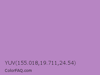 YUV 155.018,19.711,24.54 Color is a light purple color and the nearest color is African Violet #b284be. Hex code #b785c3 and RGB value is rgb(183,133,195). In RGB color space, this color is composed of 72% red, 52% green, 76% blue, In CMYK color space, this color is composed of 6% cyan, 32% magenta, 0% yellow , 24% black , In HSL color space, this color has a hue angle of 288° , 34% saturation and 64% lightness.