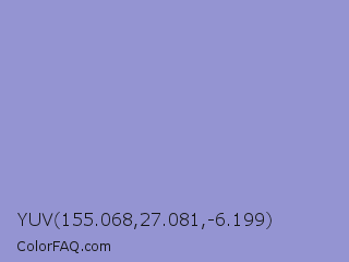 YUV 155.068,27.081,-6.199 Color is a light blue color and the nearest color is Blue Bell Crayola #9999cc. Hex code #9494d2 and RGB value is rgb(148,148,210). In RGB color space, this color is composed of 58% red, 58% green, 82% blue, In CMYK color space, this color is composed of 30% cyan, 30% magenta, 0% yellow , 18% black , In HSL color space, this color has a hue angle of 240° , 41% saturation and 70% lightness.