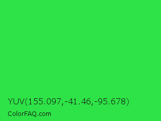 YUV 155.097,-41.46,-95.678 Color is a normal green color and the nearest color is Lime Green #32cd32. Hex code #2ee347 and RGB value is rgb(46,227,71). In RGB color space, this color is composed of 18% red, 89% green, 28% blue, In CMYK color space, this color is composed of 80% cyan, 0% magenta, 69% yellow , 11% black , In HSL color space, this color has a hue angle of 128° , 76% saturation and 54% lightness.