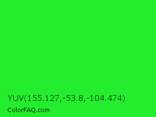 YUV 155.127,-53.8,-104.474 Color is a normal green color and the nearest color is Lime Green #32cd32. Hex code #24ed2e and RGB value is rgb(36,237,46). In RGB color space, this color is composed of 14% red, 93% green, 18% blue, In CMYK color space, this color is composed of 85% cyan, 0% magenta, 81% yellow , 7% black , In HSL color space, this color has a hue angle of 123° , 85% saturation and 54% lightness.