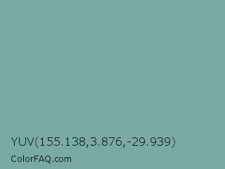YUV 155.138,3.876,-29.939 Color is a normal cyan color and the nearest color is Acapulco #7cb0a1. Hex code #79aba3 and RGB value is rgb(121,171,163). In RGB color space, this color is composed of 47% red, 67% green, 64% blue, In CMYK color space, this color is composed of 29% cyan, 0% magenta, 5% yellow , 33% black , In HSL color space, this color has a hue angle of 170° , 23% saturation and 57% lightness.