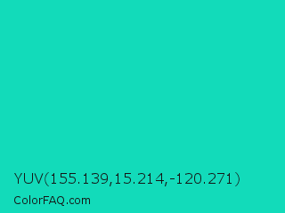 YUV 155.139,15.214,-120.271 Color is a normal cyan color and the nearest color is Java #1fc2c2. Hex code #12dbba and RGB value is rgb(18,219,186). In RGB color space, this color is composed of 7% red, 86% green, 73% blue, In CMYK color space, this color is composed of 92% cyan, 0% magenta, 15% yellow , 14% black , In HSL color space, this color has a hue angle of 170° , 85% saturation and 46% lightness.