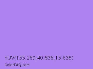 YUV 155.169,40.836,15.638 Color is a light violet color and the nearest color is Lavender #b57edc. Hex code #ad82ee and RGB value is rgb(173,130,238). In RGB color space, this color is composed of 68% red, 51% green, 93% blue, In CMYK color space, this color is composed of 27% cyan, 45% magenta, 0% yellow , 7% black , In HSL color space, this color has a hue angle of 264° , 76% saturation and 72% lightness.