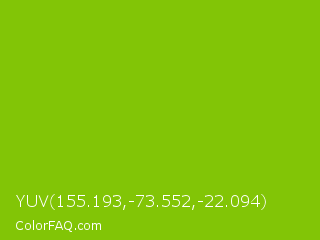 YUV 155.193,-73.552,-22.094 Color is a normal green color and the nearest color is Apple Green #8db600. Hex code #82c506 and RGB value is rgb(130,197,6). In RGB color space, this color is composed of 51% red, 77% green, 2% blue, In CMYK color space, this color is composed of 34% cyan, 0% magenta, 97% yellow , 23% black , In HSL color space, this color has a hue angle of 81° , 94% saturation and 40% lightness.