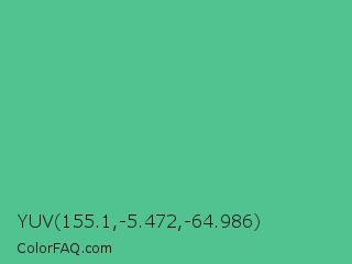 YUV 155.1,-5.472,-64.986 Color is a normal green color and the nearest color is Ocean Green #48bf91. Hex code #51c390 and RGB value is rgb(81,195,144). In RGB color space, this color is composed of 32% red, 76% green, 56% blue, In CMYK color space, this color is composed of 58% cyan, 0% magenta, 26% yellow , 24% black , In HSL color space, this color has a hue angle of 153° , 49% saturation and 54% lightness.