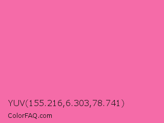 YUV 155.216,6.303,78.741 Color is a light rose color and the nearest color is Cyclamen #f56fa1. Hex code #f56ba8 and RGB value is rgb(245,107,168). In RGB color space, this color is composed of 96% red, 42% green, 66% blue, In CMYK color space, this color is composed of 0% cyan, 56% magenta, 31% yellow , 4% black , In HSL color space, this color has a hue angle of 333° , 87% saturation and 69% lightness.