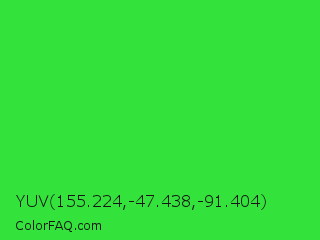 YUV 155.224,-47.438,-91.404 Color is a normal green color and the nearest color is Lime Green #32cd32. Hex code #33e33b and RGB value is rgb(51,227,59). In RGB color space, this color is composed of 20% red, 89% green, 23% blue, In CMYK color space, this color is composed of 78% cyan, 0% magenta, 74% yellow , 11% black , In HSL color space, this color has a hue angle of 123° , 76% saturation and 55% lightness.