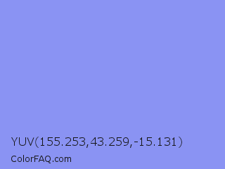 YUV 155.253,43.259,-15.131 Color is a light blue color and the nearest color is Portage #8b9fee. Hex code #8a93f3 and RGB value is rgb(138,147,243). In RGB color space, this color is composed of 54% red, 58% green, 95% blue, In CMYK color space, this color is composed of 43% cyan, 40% magenta, 0% yellow , 5% black , In HSL color space, this color has a hue angle of 235° , 81% saturation and 75% lightness.