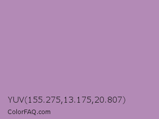 YUV 155.275,13.175,20.807 Color is a light magenta color and the nearest color is African Violet #b284be. Hex code #b38ab6 and RGB value is rgb(179,138,182). In RGB color space, this color is composed of 70% red, 54% green, 71% blue, In CMYK color space, this color is composed of 2% cyan, 24% magenta, 0% yellow , 29% black , In HSL color space, this color has a hue angle of 296° , 23% saturation and 63% lightness.