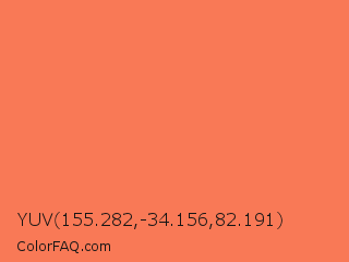 YUV 155.282,-34.156,82.191 Color is a light red color and the nearest color is Coral #ff7f50. Hex code #f97956 and RGB value is rgb(249,121,86). In RGB color space, this color is composed of 98% red, 47% green, 34% blue, In CMYK color space, this color is composed of 0% cyan, 51% magenta, 65% yellow , 2% black , In HSL color space, this color has a hue angle of 13° , 93% saturation and 66% lightness.
