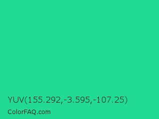YUV 155.292,-3.595,-107.25 Color is a normal green color and the nearest color is Shamrock #33cc99. Hex code #21db94 and RGB value is rgb(33,219,148). In RGB color space, this color is composed of 13% red, 86% green, 58% blue, In CMYK color space, this color is composed of 85% cyan, 0% magenta, 32% yellow , 14% black , In HSL color space, this color has a hue angle of 157° , 74% saturation and 49% lightness.