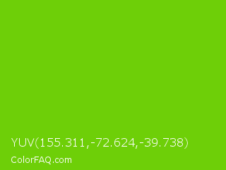 YUV 155.311,-72.624,-39.738 Color is a normal green color and the nearest color is Lima #76bd17. Hex code #6ecf08 and RGB value is rgb(110,207,8). In RGB color space, this color is composed of 43% red, 81% green, 3% blue, In CMYK color space, this color is composed of 47% cyan, 0% magenta, 96% yellow , 19% black , In HSL color space, this color has a hue angle of 89° , 93% saturation and 42% lightness.