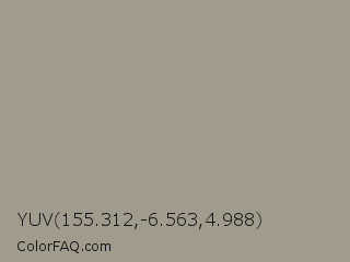 YUV 155.312,-6.563,4.988 Color is a normal orange color and the nearest color is Zorba #a59b91. Hex code #a19b8e and RGB value is rgb(161,155,142). In RGB color space, this color is composed of 63% red, 61% green, 56% blue, In CMYK color space, this color is composed of 0% cyan, 4% magenta, 12% yellow , 37% black , In HSL color space, this color has a hue angle of 41° , 9% saturation and 59% lightness.