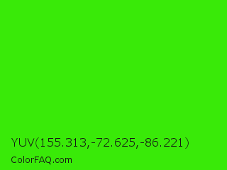 YUV 155.313,-72.625,-86.221 Color is a normal green color and the nearest color is Harlequin #3fff00. Hex code #39ea08 and RGB value is rgb(57,234,8). In RGB color space, this color is composed of 22% red, 92% green, 3% blue, In CMYK color space, this color is composed of 76% cyan, 0% magenta, 97% yellow , 8% black , In HSL color space, this color has a hue angle of 107° , 93% saturation and 47% lightness.