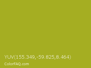 YUV 155.349,-59.825,8.464 Color is a normal yellow color and the nearest color is Citron #9fa91f. Hex code #a5ae22 and RGB value is rgb(165,174,34). In RGB color space, this color is composed of 65% red, 68% green, 13% blue, In CMYK color space, this color is composed of 5% cyan, 0% magenta, 80% yellow , 32% black , In HSL color space, this color has a hue angle of 64° , 67% saturation and 41% lightness.