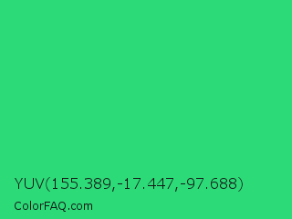 YUV 155.389,-17.447,-97.688 Color is a normal green color and the nearest color is UFO Green #3cd070. Hex code #2cdb78 and RGB value is rgb(44,219,120). In RGB color space, this color is composed of 17% red, 86% green, 47% blue, In CMYK color space, this color is composed of 80% cyan, 0% magenta, 45% yellow , 14% black , In HSL color space, this color has a hue angle of 146° , 71% saturation and 52% lightness.