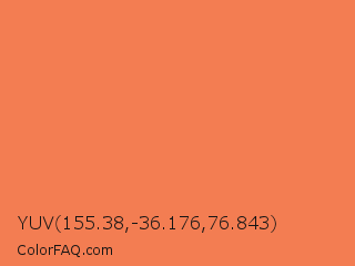 YUV 155.38,-36.176,76.843 Color is a light orange color and the nearest color is Mandarin #f37a48. Hex code #f37d52 and RGB value is rgb(243,125,82). In RGB color space, this color is composed of 95% red, 49% green, 32% blue, In CMYK color space, this color is composed of 0% cyan, 49% magenta, 66% yellow , 5% black , In HSL color space, this color has a hue angle of 16° , 87% saturation and 64% lightness.