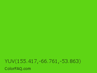 YUV 155.417,-66.761,-53.863 Color is a normal green color and the nearest color is Harlequin Green #46cb18. Hex code #5ed514 and RGB value is rgb(94,213,20). In RGB color space, this color is composed of 37% red, 84% green, 8% blue, In CMYK color space, this color is composed of 56% cyan, 0% magenta, 91% yellow , 16% black , In HSL color space, this color has a hue angle of 97° , 83% saturation and 46% lightness.