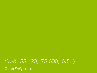YUV 155.423,-75.638,-6.51 Color is a normal lime color and the nearest color is Apple Green #8db600. Hex code #94bd02 and RGB value is rgb(148,189,2). In RGB color space, this color is composed of 58% red, 74% green, 1% blue, In CMYK color space, this color is composed of 22% cyan, 0% magenta, 99% yellow , 26% black , In HSL color space, this color has a hue angle of 73° , 98% saturation and 37% lightness.