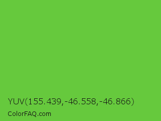 YUV 155.439,-46.558,-46.866 Color is a normal green color and the nearest color is Green RYB #66b032. Hex code #66c93d and RGB value is rgb(102,201,61). In RGB color space, this color is composed of 40% red, 79% green, 24% blue, In CMYK color space, this color is composed of 49% cyan, 0% magenta, 70% yellow , 21% black , In HSL color space, this color has a hue angle of 102° , 56% saturation and 51% lightness.