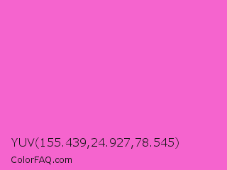 YUV 155.439,24.927,78.545 Color is a light magenta color and the nearest color is Rose Pink #ff66cc. Hex code #f564ce and RGB value is rgb(245,100,206). In RGB color space, this color is composed of 96% red, 39% green, 81% blue, In CMYK color space, this color is composed of 0% cyan, 59% magenta, 16% yellow , 4% black , In HSL color space, this color has a hue angle of 316° , 88% saturation and 68% lightness.