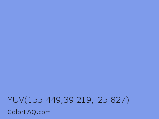 YUV 155.449,39.219,-25.827 Color is a light blue color and the nearest color is Portage #8b9fee. Hex code #7e9beb and RGB value is rgb(126,155,235). In RGB color space, this color is composed of 49% red, 61% green, 92% blue, In CMYK color space, this color is composed of 46% cyan, 34% magenta, 0% yellow , 8% black , In HSL color space, this color has a hue angle of 224° , 73% saturation and 71% lightness.