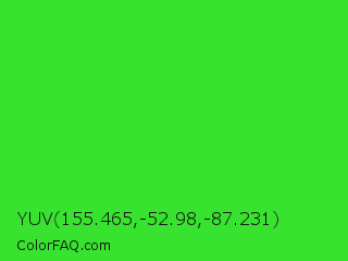 YUV 155.465,-52.98,-87.231 Color is a normal green color and the nearest color is Lime Green #32cd32. Hex code #38e330 and RGB value is rgb(56,227,48). In RGB color space, this color is composed of 22% red, 89% green, 19% blue, In CMYK color space, this color is composed of 75% cyan, 0% magenta, 79% yellow , 11% black , In HSL color space, this color has a hue angle of 117° , 76% saturation and 54% lightness.