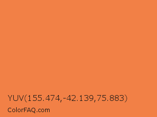 YUV 155.474,-42.139,75.883 Color is a light orange color and the nearest color is Mandarin #f37a48. Hex code #f28046 and RGB value is rgb(242,128,70). In RGB color space, this color is composed of 95% red, 50% green, 27% blue, In CMYK color space, this color is composed of 0% cyan, 47% magenta, 71% yellow , 5% black , In HSL color space, this color has a hue angle of 20° , 87% saturation and 61% lightness.