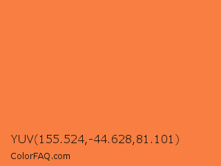 YUV 155.524,-44.628,81.101 Color is a light orange color and the nearest color is Mango Tango #ff8243. Hex code #f87e41 and RGB value is rgb(248,126,65). In RGB color space, this color is composed of 97% red, 49% green, 25% blue, In CMYK color space, this color is composed of 0% cyan, 49% magenta, 74% yellow , 3% black , In HSL color space, this color has a hue angle of 20° , 93% saturation and 61% lightness.