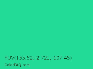 YUV 155.52,-2.721,-107.45 Color is a normal green color and the nearest color is Shamrock #33cc99. Hex code #21db96 and RGB value is rgb(33,219,150). In RGB color space, this color is composed of 13% red, 86% green, 59% blue, In CMYK color space, this color is composed of 85% cyan, 0% magenta, 32% yellow , 14% black , In HSL color space, this color has a hue angle of 158° , 74% saturation and 49% lightness.