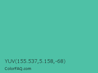 YUV 155.537,5.158,-68 Color is a normal cyan color and the nearest color is Puerto Rico #3fc1aa. Hex code #4ec1a6 and RGB value is rgb(78,193,166). In RGB color space, this color is composed of 31% red, 76% green, 65% blue, In CMYK color space, this color is composed of 60% cyan, 0% magenta, 14% yellow , 24% black , In HSL color space, this color has a hue angle of 166° , 48% saturation and 53% lightness.