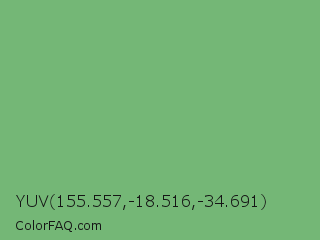 YUV 155.557,-18.516,-34.691 Color is a normal green color and the nearest color is Iguana Green #71bc78. Hex code #74b776 and RGB value is rgb(116,183,118). In RGB color space, this color is composed of 45% red, 72% green, 46% blue, In CMYK color space, this color is composed of 37% cyan, 0% magenta, 36% yellow , 28% black , In HSL color space, this color has a hue angle of 122° , 32% saturation and 59% lightness.