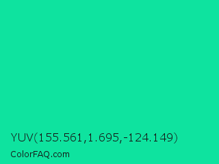YUV 155.561,1.695,-124.149 Color is a normal green color and the nearest color is Medium Spring Green #00fa9a. Hex code #0ee39f and RGB value is rgb(14,227,159). In RGB color space, this color is composed of 5% red, 89% green, 62% blue, In CMYK color space, this color is composed of 94% cyan, 0% magenta, 30% yellow , 11% black , In HSL color space, this color has a hue angle of 161° , 88% saturation and 47% lightness.