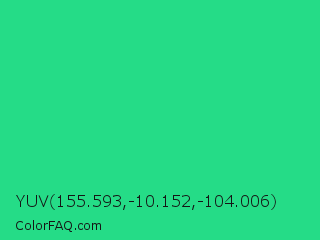 YUV 155.593,-10.152,-104.006 Color is a normal green color and the nearest color is Shamrock #33cc99. Hex code #25dc87 and RGB value is rgb(37,220,135). In RGB color space, this color is composed of 15% red, 86% green, 53% blue, In CMYK color space, this color is composed of 83% cyan, 0% magenta, 39% yellow , 14% black , In HSL color space, this color has a hue angle of 152° , 72% saturation and 50% lightness.