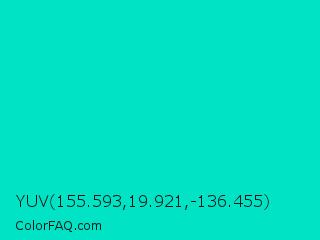 YUV 155.593,19.921,-136.455 Color is a normal cyan color and the nearest color is Robins Egg Blue #00cccc. Hex code #00e3c4 and RGB value is rgb(0,227,196). In RGB color space, this color is composed of 0% red, 89% green, 77% blue, In CMYK color space, this color is composed of 100% cyan, 0% magenta, 14% yellow , 11% black , In HSL color space, this color has a hue angle of 172° , 100% saturation and 45% lightness.