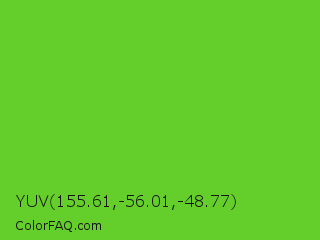 YUV 155.61,-56.01,-48.77 Color is a normal green color and the nearest color is Green RYB #66b032. Hex code #64ce2a and RGB value is rgb(100,206,42). In RGB color space, this color is composed of 39% red, 81% green, 16% blue, In CMYK color space, this color is composed of 51% cyan, 0% magenta, 80% yellow , 19% black , In HSL color space, this color has a hue angle of 99° , 66% saturation and 49% lightness.