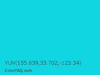 YUV 155.639,33.702,-123.34 Color is a normal cyan color and the nearest color is Bright Turquoise #08e8de. Hex code #0fd6e0 and RGB value is rgb(15,214,224). In RGB color space, this color is composed of 6% red, 84% green, 88% blue, In CMYK color space, this color is composed of 93% cyan, 4% magenta, 0% yellow , 12% black , In HSL color space, this color has a hue angle of 183° , 87% saturation and 47% lightness.