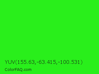 YUV 155.63,-63.415,-100.531 Color is a normal green color and the nearest color is Neon Green #39ff14. Hex code #29ef1b and RGB value is rgb(41,239,27). In RGB color space, this color is composed of 16% red, 94% green, 11% blue, In CMYK color space, this color is composed of 83% cyan, 0% magenta, 89% yellow , 6% black , In HSL color space, this color has a hue angle of 116° , 87% saturation and 52% lightness.