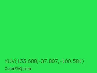 YUV 155.688,-37.807,-100.581 Color is a normal green color and the nearest color is Malachite #0bda51. Hex code #29e54f and RGB value is rgb(41,229,79). In RGB color space, this color is composed of 16% red, 90% green, 31% blue, In CMYK color space, this color is composed of 82% cyan, 0% magenta, 66% yellow , 10% black , In HSL color space, this color has a hue angle of 132° , 78% saturation and 53% lightness.