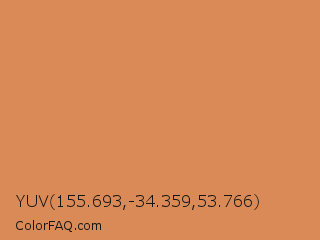 YUV 155.693,-34.359,53.766 Color is a normal orange color and the nearest color is Raw Sienna #d68a59. Hex code #d98a56 and RGB value is rgb(217,138,86). In RGB color space, this color is composed of 85% red, 54% green, 34% blue, In CMYK color space, this color is composed of 0% cyan, 36% magenta, 60% yellow , 15% black , In HSL color space, this color has a hue angle of 24° , 63% saturation and 59% lightness.